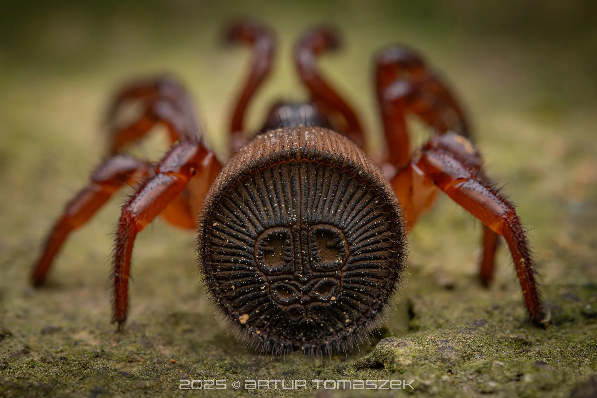 Cyclocosmia latusicosta are trapdoor spiders with abdomens that are abruptly truncated, ending in a hardened disc that is strengthened by a system of ribs and grooves. They use it to clog the entrance of their burrows, a phenomenon called phragmosis (see the third picture below).